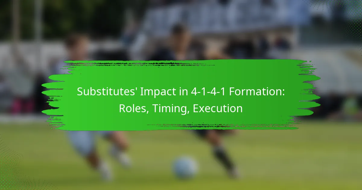 Substitutes in a 4-1-4-1 formation are vital for altering the dynamics of a match, as their roles can shift focus between defense, midfield control, and attack. The timing of these substitutions is critical; early changes can inject energy and tactical shifts, while late adjustments may disrupt team cohesion. Successful execution hinges on meticulous pre-match planning and real-time adaptability, which can greatly enhance a team’s performance and responsiveness during the game.
